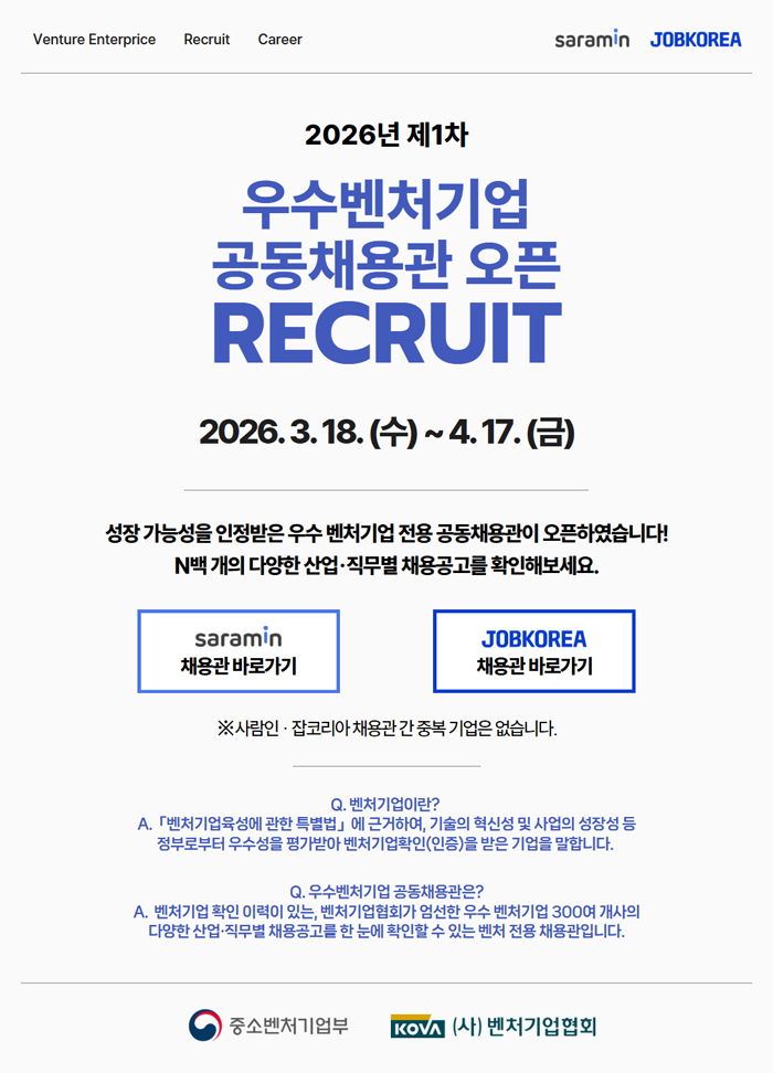 2026년 1차 벤처기업 공동채용 대졸 채용 공고 리스트 공유드립니다.
